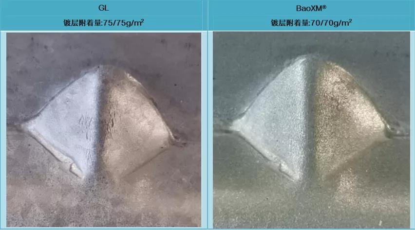 BaoXM®鍍層鋼板可沿用常規熱鍍鋅的焊接工藝,焊點、焊縫等加工損傷部位具備一定自修復能力。