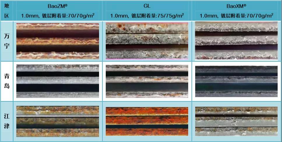 根據戶外掛片結果,BaoXM®鍍層在典型海洋氣候、酸雨氣候均表現出較熱鍍鋅、鍍鋁鋅更強的環境耐蝕性。