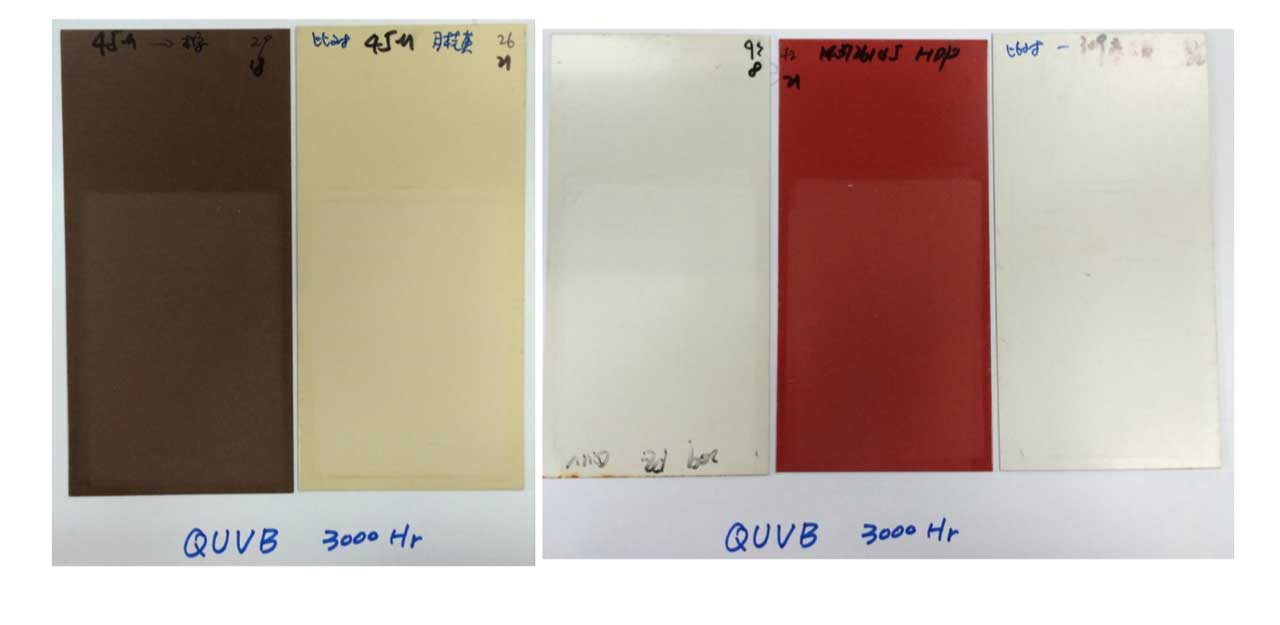 經(jīng)過3000小時(shí)QUVB試驗(yàn)后,45微米氟碳產(chǎn)品涂層粉化仍保 持0級。