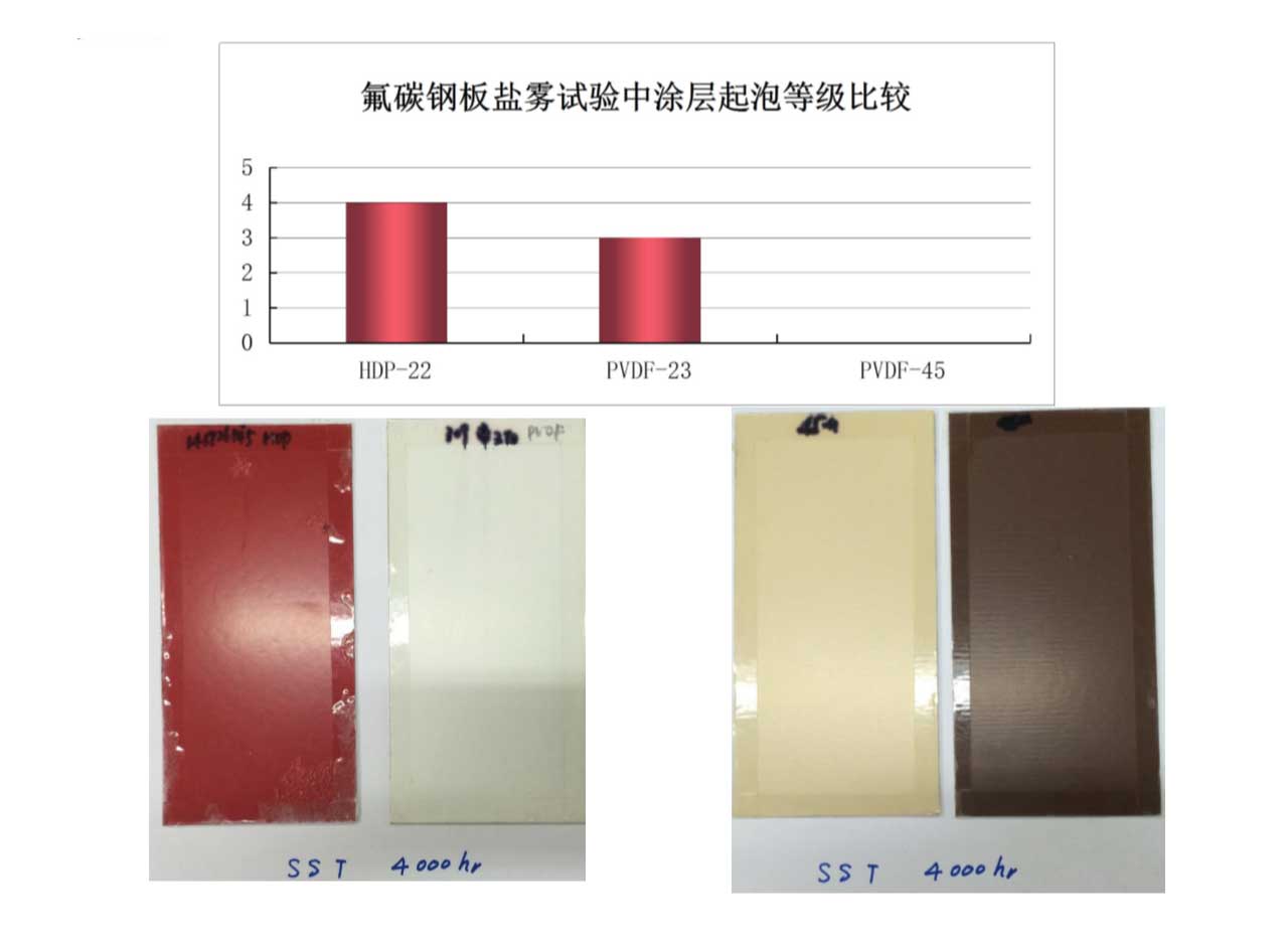 經(jīng)過4000小時(shí)鹽霧試驗(yàn)后,45微米氟碳產(chǎn)品涂層仍保持0級。