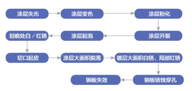 彩涂鋼板的失效過程如下圖所示,涂層失效、鍍層失效乃至鋼板穿孔是關鍵的腐蝕發生過程。因此提高涂鍍層厚度,且采用耐候、耐蝕涂鍍層是最有效的防止彩涂鋼板腐蝕失效的手段。