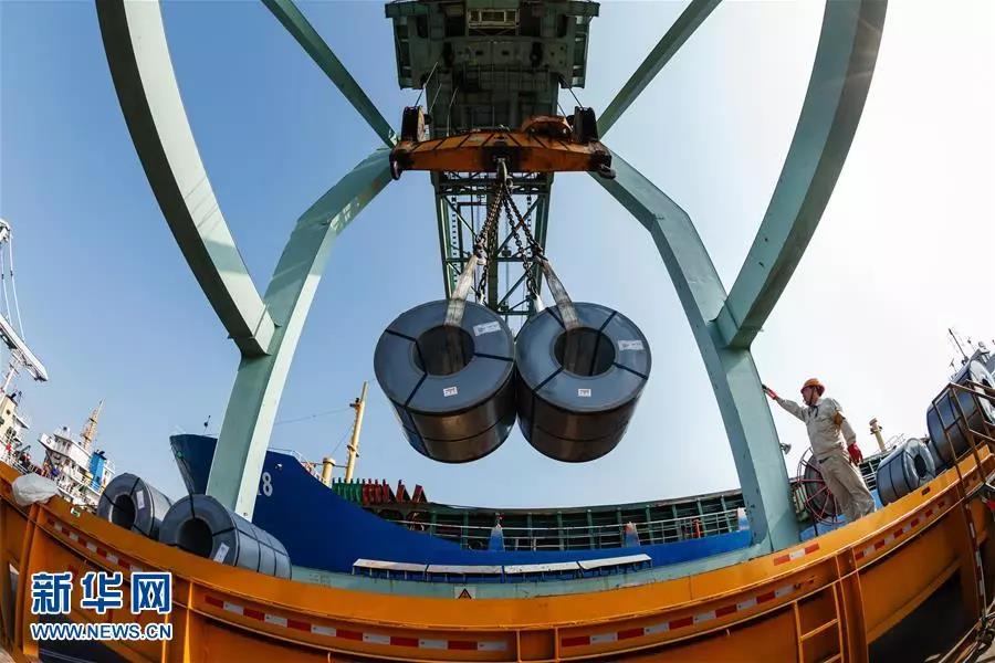 這是成品鋼材在寶鋼股份碼頭吊裝(資料照片)。新華社發(寶鋼股份供圖)