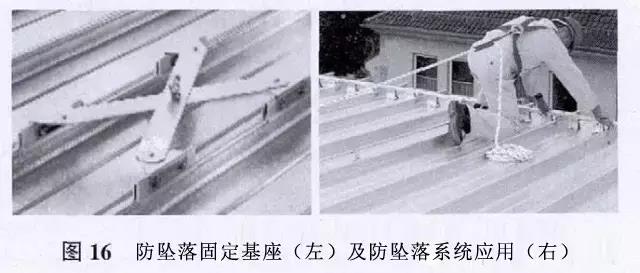 屋面的定期檢查、暴風(fēng)雪后清潔屋面和天溝、屋面改造,這些都需要屋面設(shè)置防墜落系統(tǒng)。防墜落系統(tǒng)包括一個(gè)堅(jiān)固、耐久且靈活的不銹鋼索,該不銹鋼索的每一端連接到屋面固定基座支架上。屋面固定基座使用鋁夾,連接到屋面板上。屋面固定基座被設(shè)計(jì)為減震器,一旦墜落發(fā)生,將變形減弱墜落的震動(dòng),并保障基座仍然安全地固定在屋面板上。